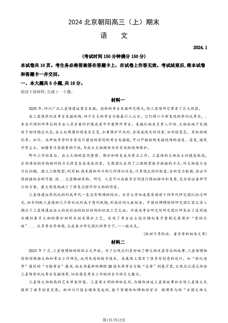 北京市朝阳区2024届高三期末语文+答案