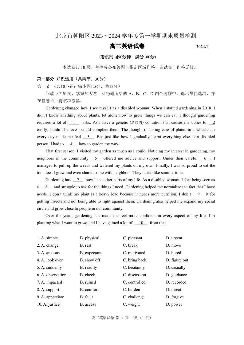 北京市朝阳区2024届高三期末英语+答案
