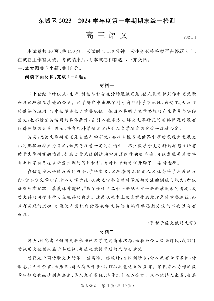 北京市东城区2024届高三上学期期末统一检测语文