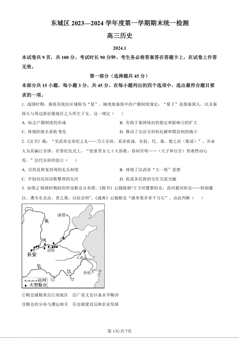北京市东城区2024届高三上学期期末统一检测历史(原卷版)