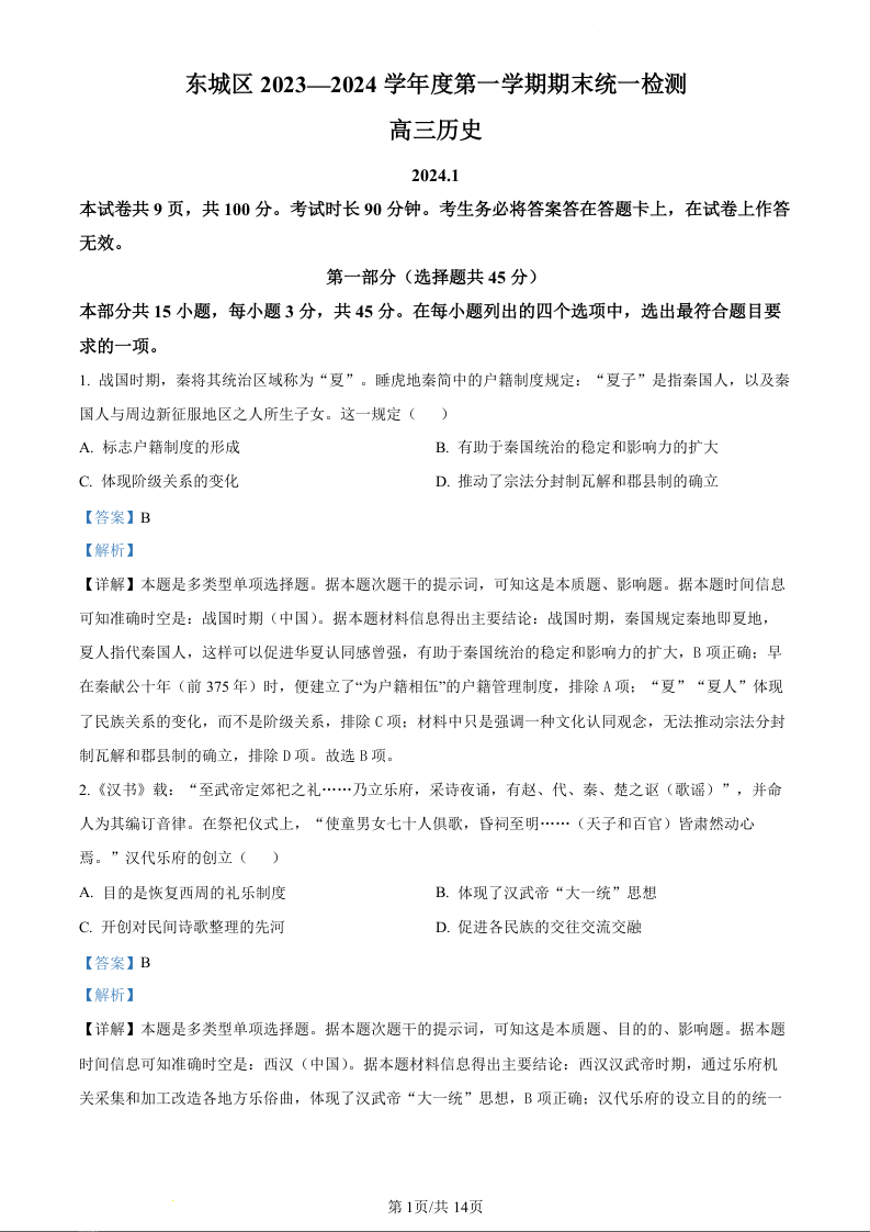 北京市东城区2024届高三上学期期末统一检测历史(精品解析版)