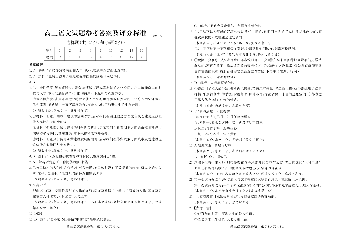 山东省滨州市2025届高三下学期第二次模拟考试语文答案