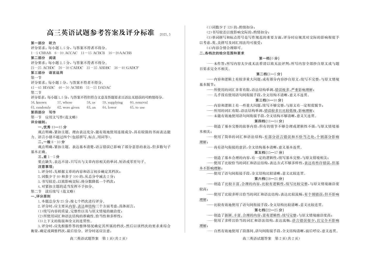 山东省滨州市2025届高三下学期第二次模拟考试英语答案