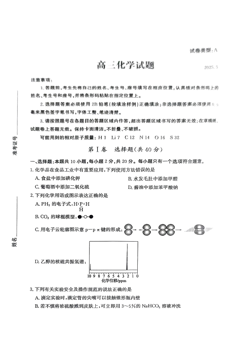山东省滨州市2025届高三下学期第二次模拟考试化学