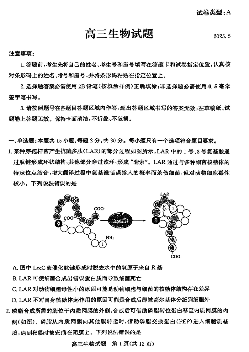 山东省滨州市2025届高三下学期第二次模拟考试生物