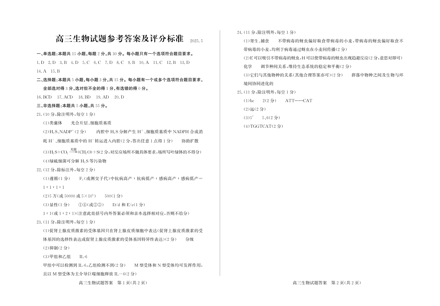 山东省滨州市2025届高三下学期第二次模拟考试生物答案