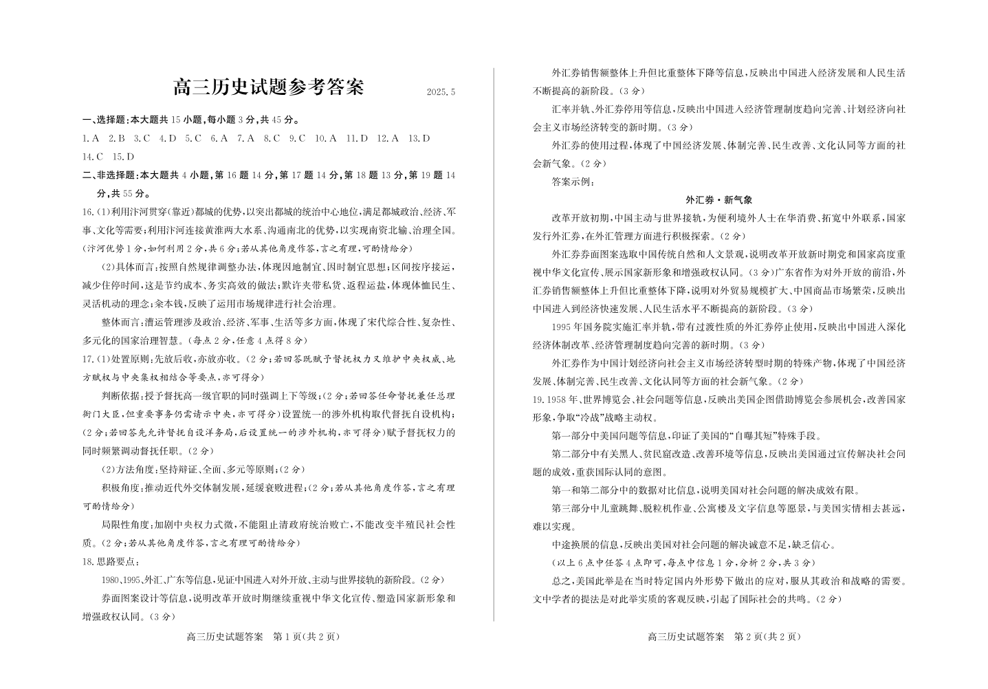 山东省滨州市2025届高三下学期第二次模拟考试历史答案