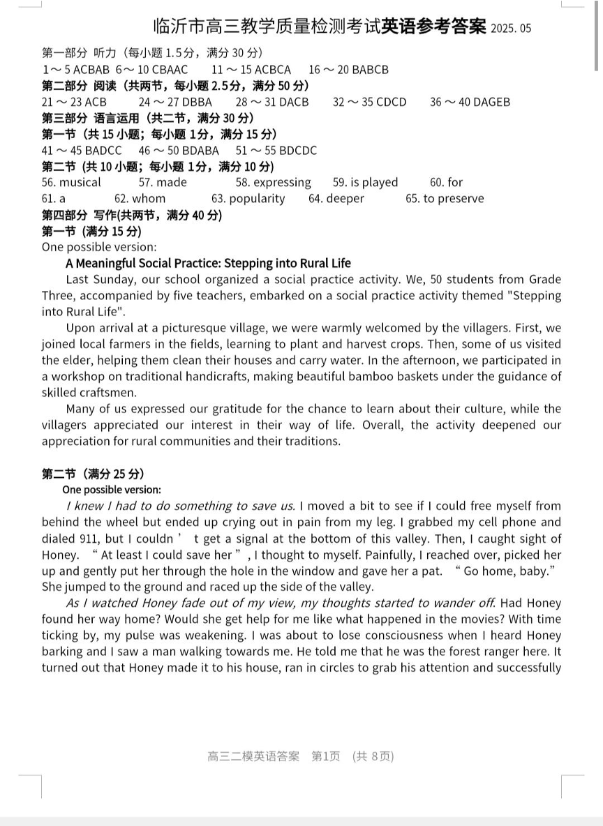 山东省临沂市2025届5月高考模拟考试(二模)英语答案