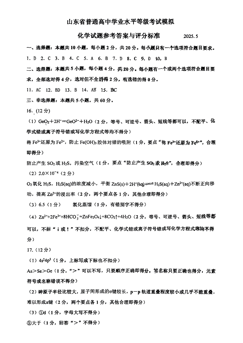 山东省临沂市2025届5月高考模拟考试(二模)化学答案