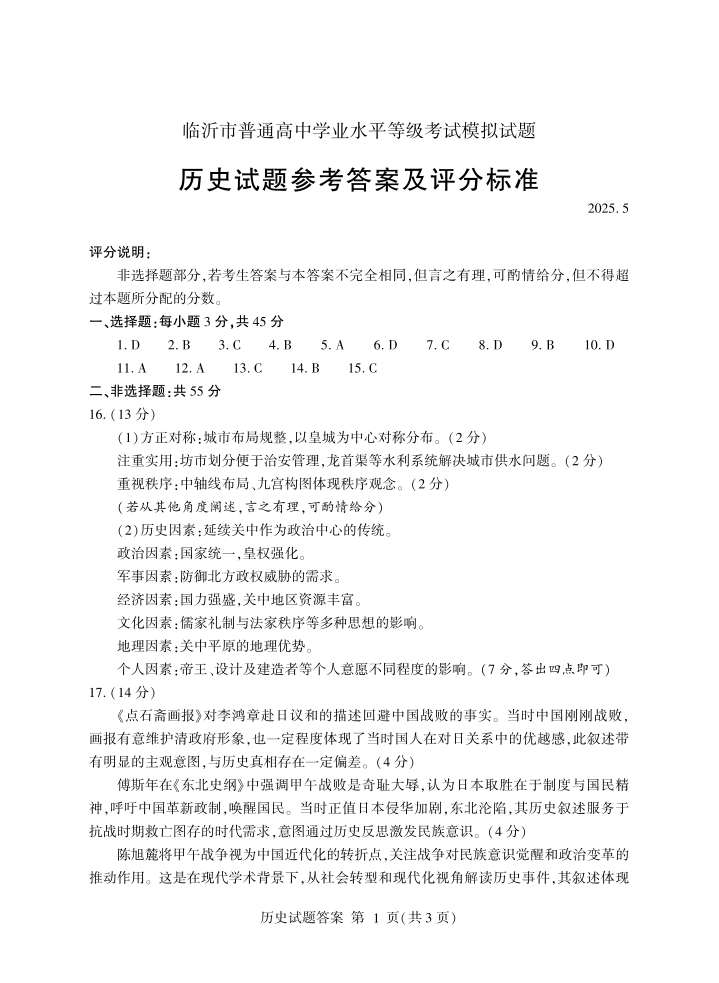 山东省临沂市2025届5月高考模拟考试(二模)历史答案