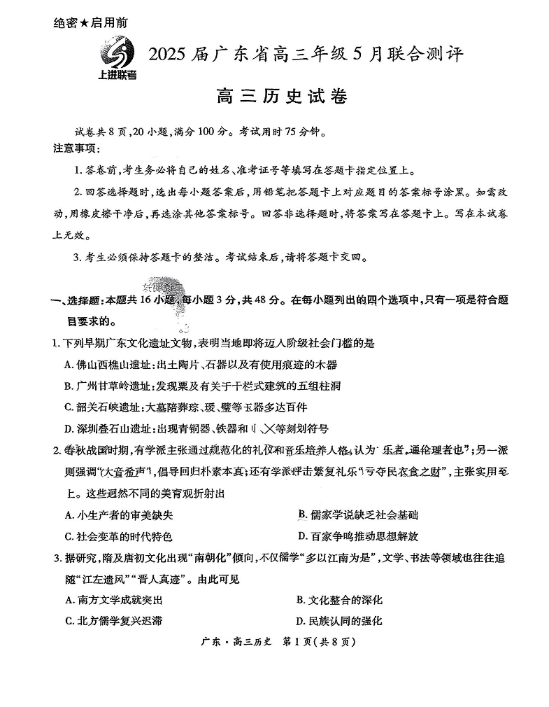 广东省上进联考2025届高三5月联合测评历史
