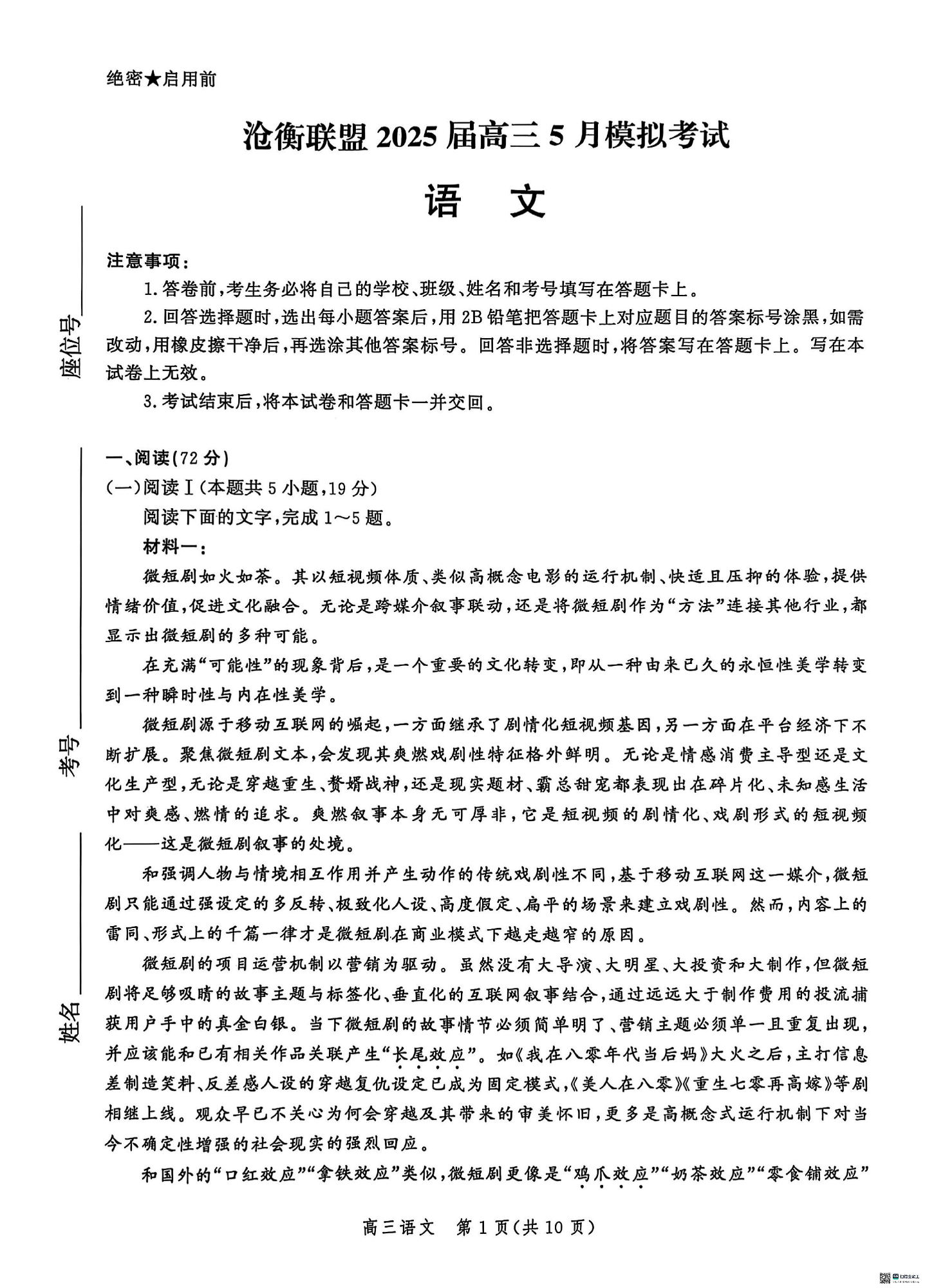 河北省沧衡联盟2025届高三下学期5月模拟考试语文+答案