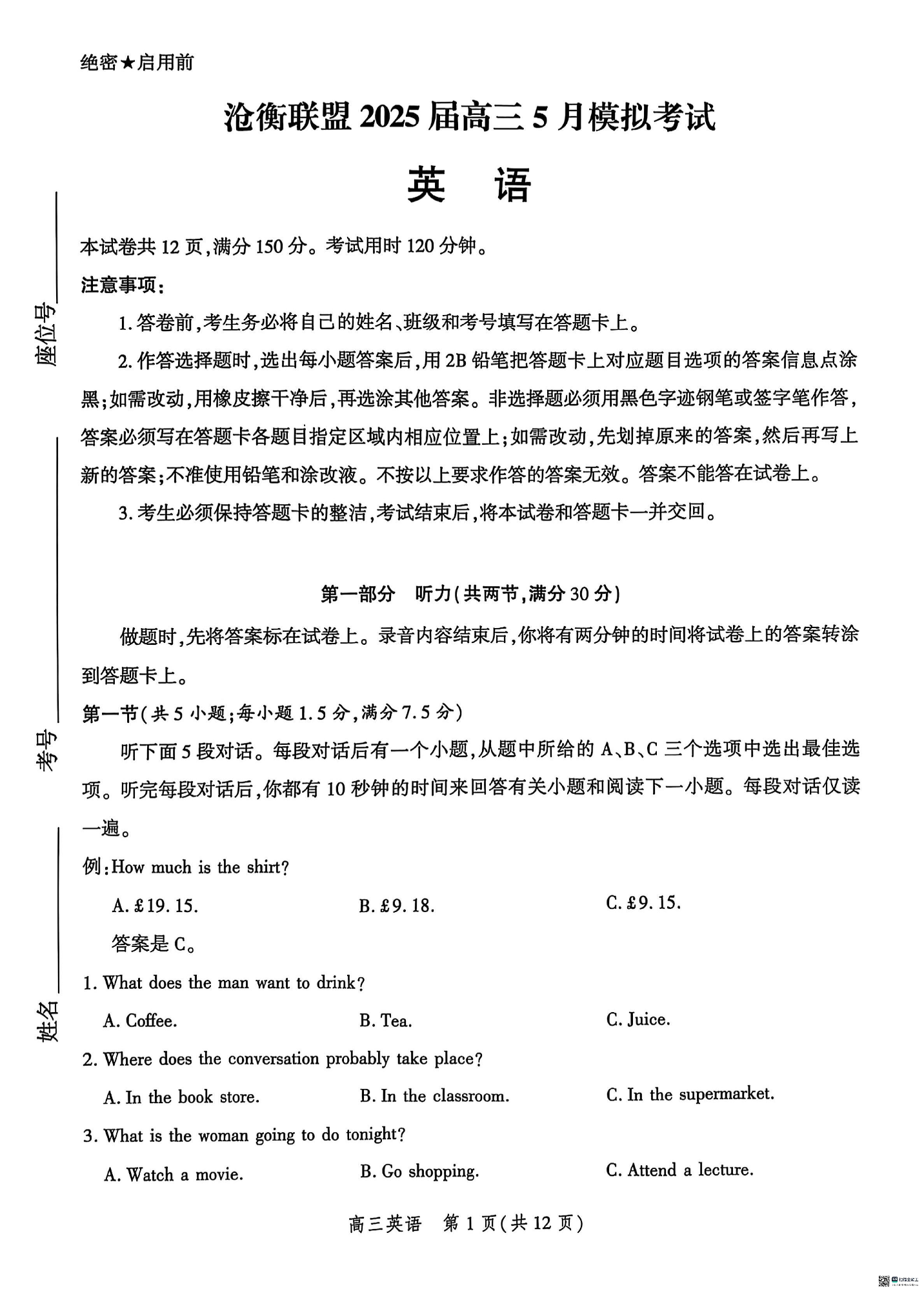 河北省沧衡联盟2025届高三下学期5月模拟考试英语+答案