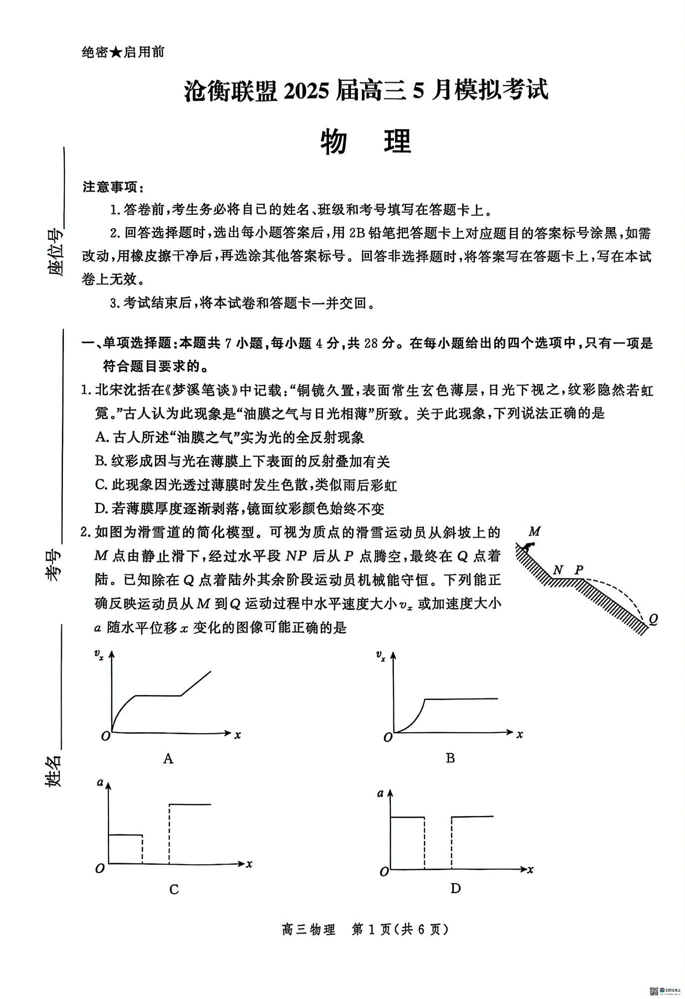河北省沧衡联盟2025届高三下学期5月模拟考试物理+答案