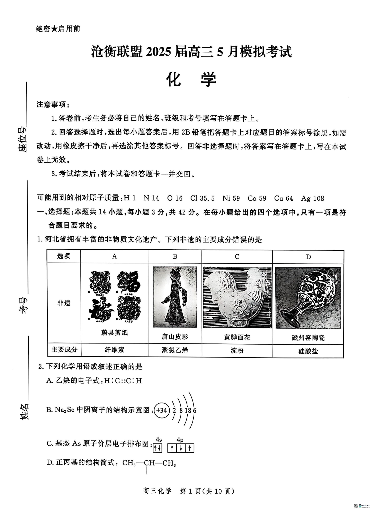 河北省沧衡联盟2025届高三下学期5月模拟考试化学+答案