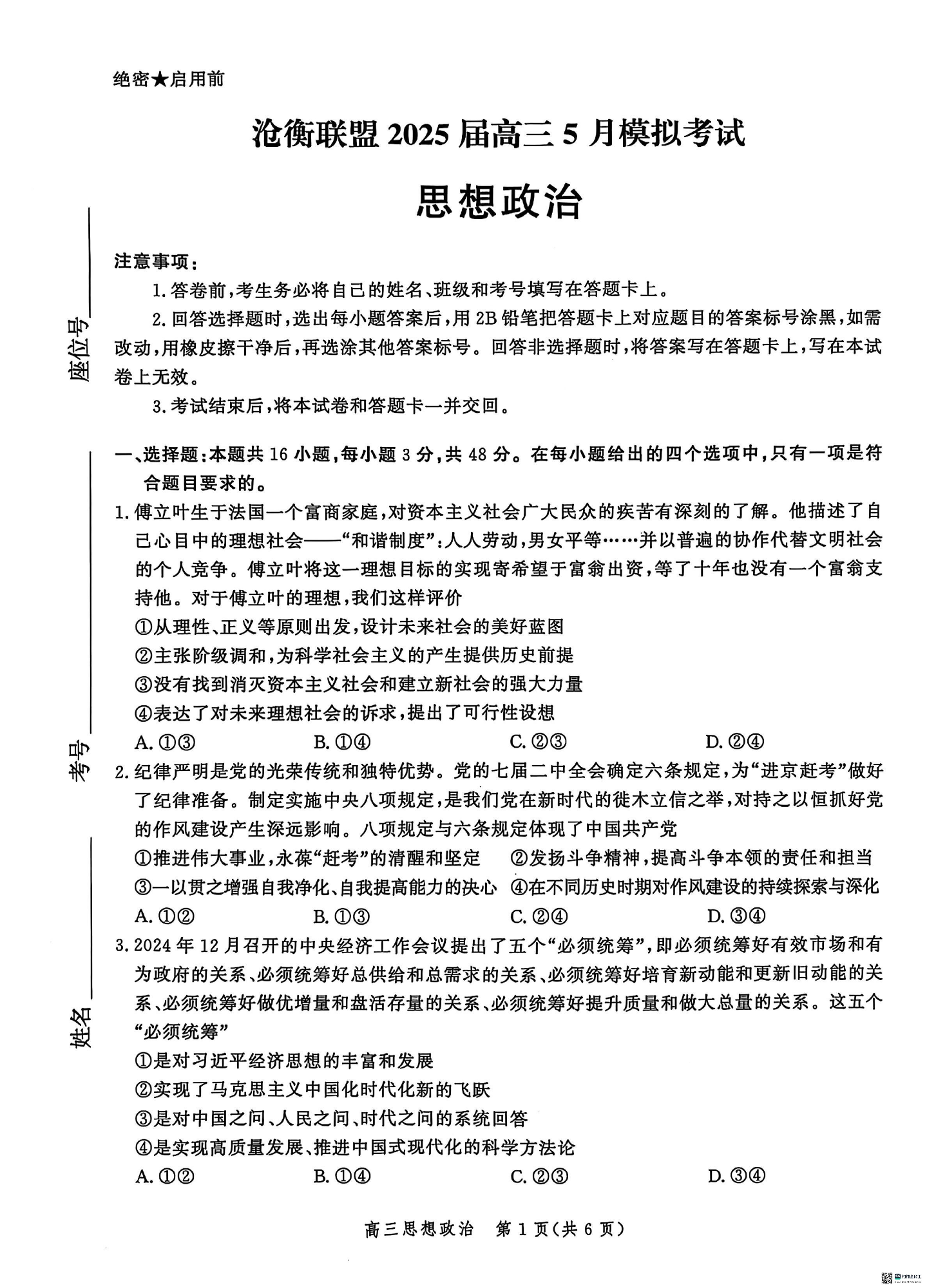河北省沧衡联盟2025届高三下学期5月模拟考试政治+答案