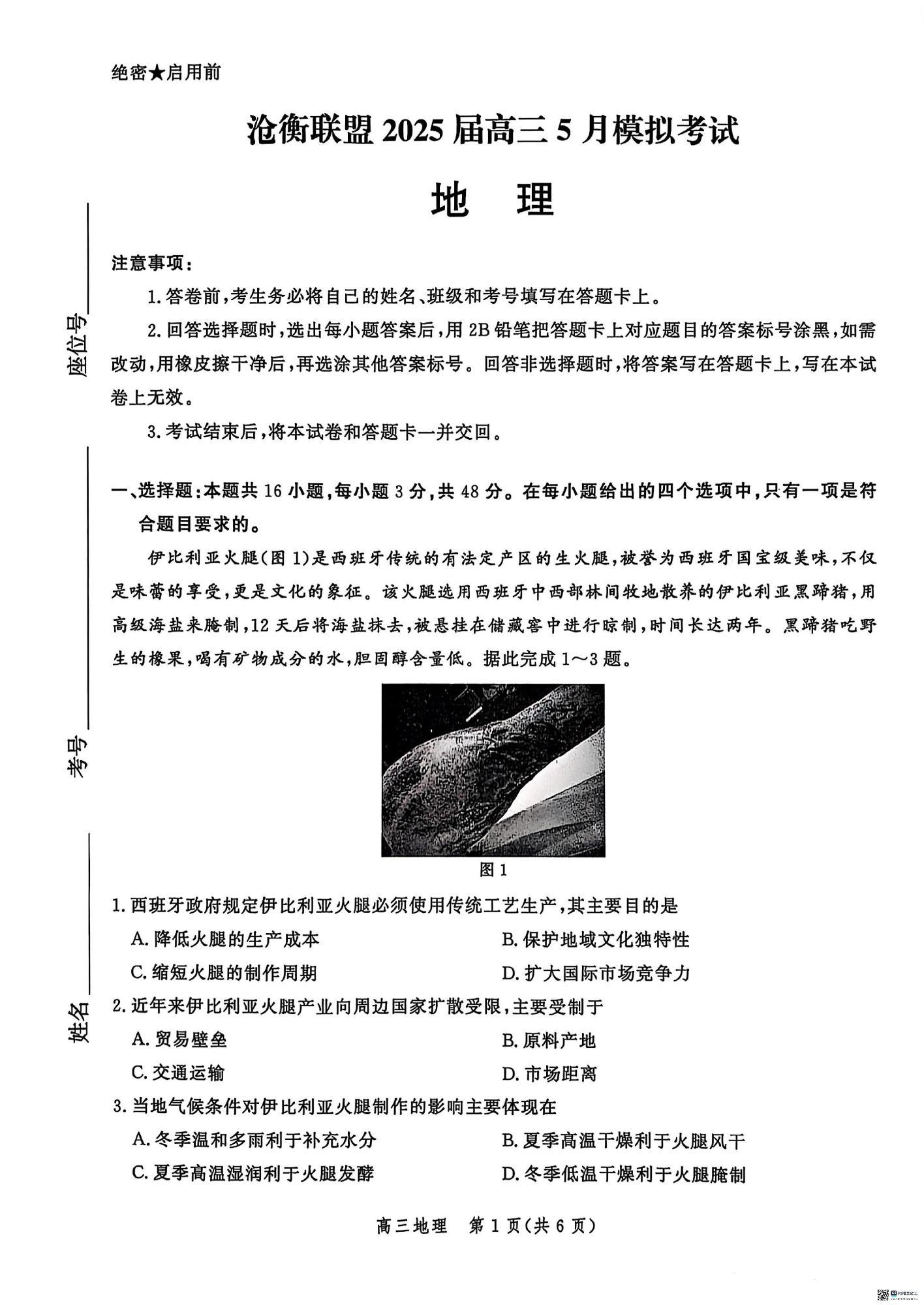 河北省沧衡联盟2025届高三下学期5月模拟考试地理+答案