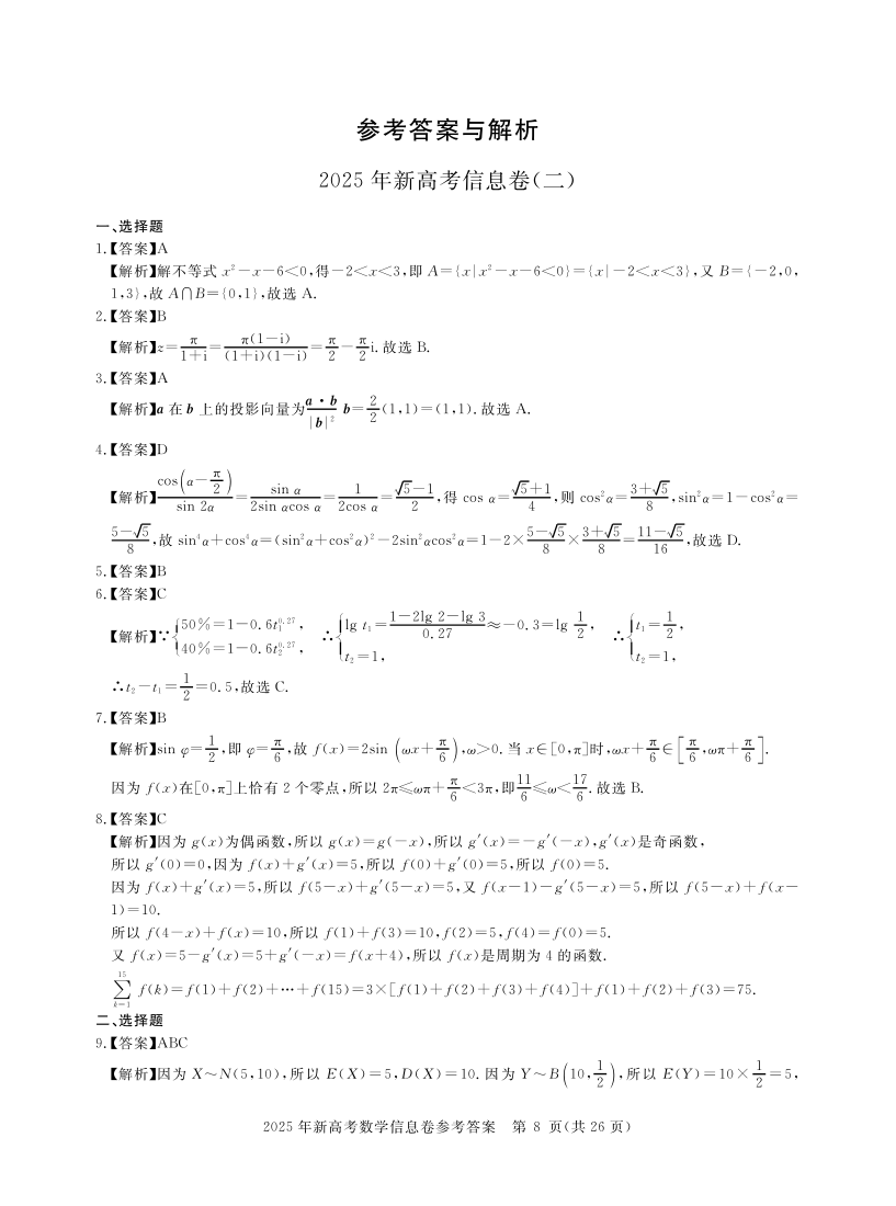湖北省2025届新高考信息卷(二)数学答案