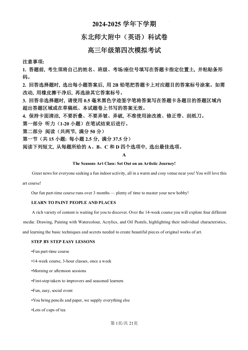 吉林省东北师大附中2025届高三下学期第四次模拟考试英语(精品解析版)