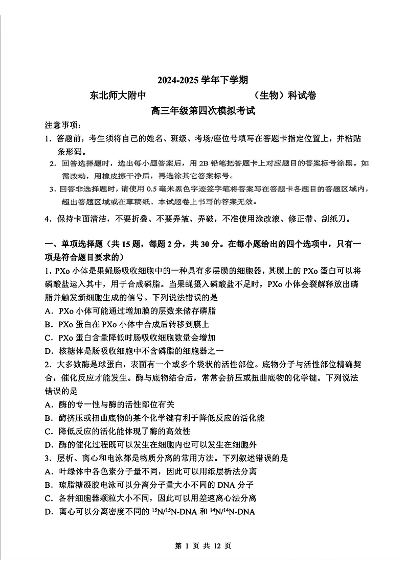 吉林省东北师大附中2025届高三下学期第四次模拟考试生物+答案