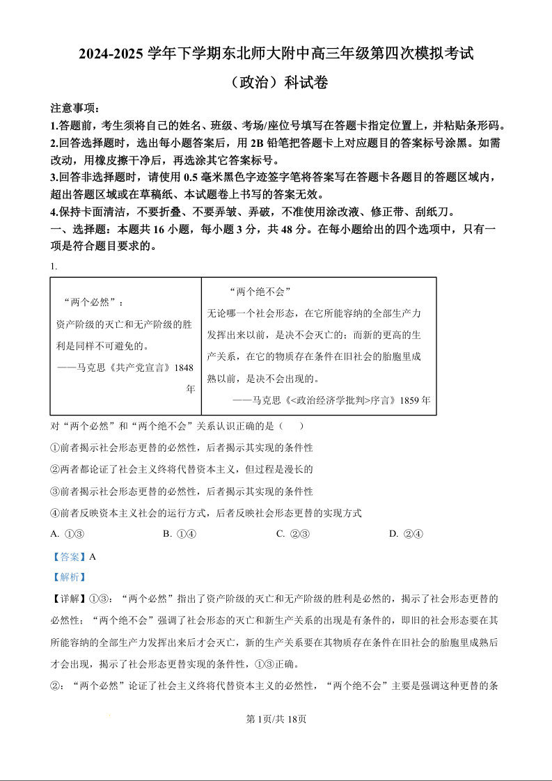 吉林省东北师大附中2025届高三下学期第四次模拟考试政治(精品解析版)