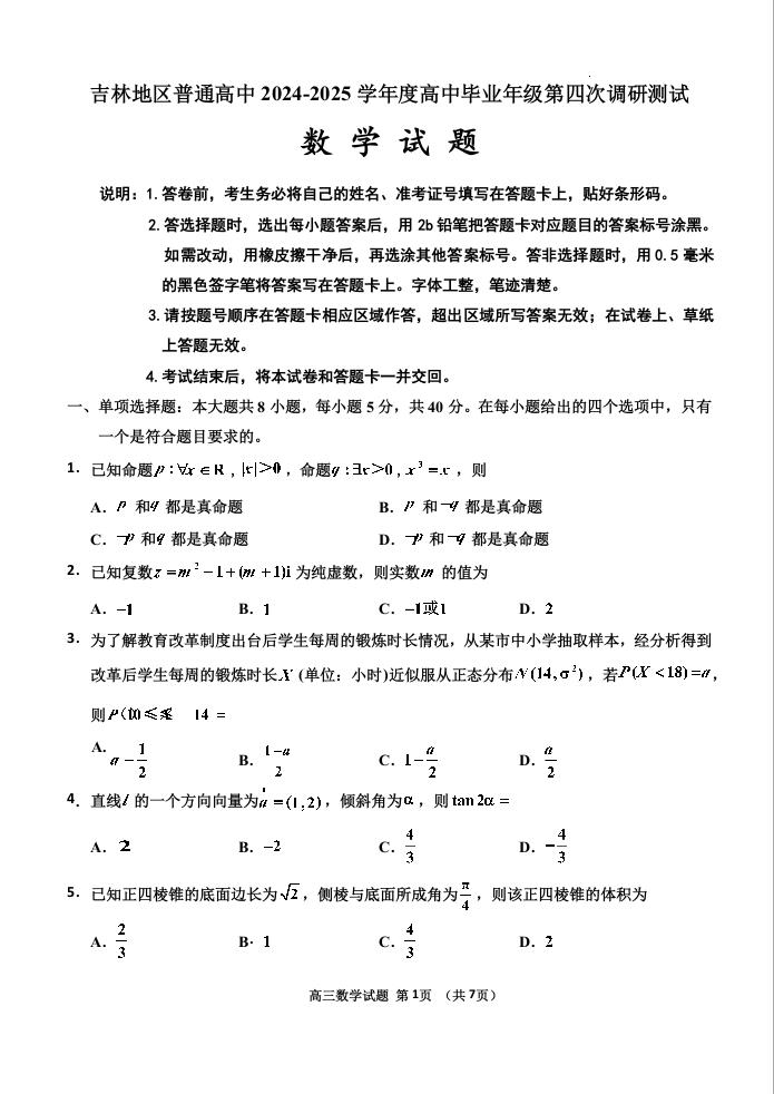 吉林省吉林地区2025届高中毕业年级第三次调研测试(三模)数学