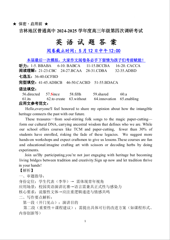 吉林省吉林地区2025届高中毕业年级第三次调研测试(三模)英语答案