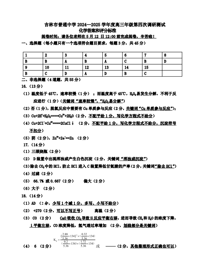 吉林省吉林地区2025届高中毕业年级第三次调研测试(三模)化学答案
