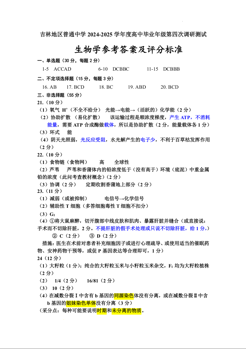 吉林省吉林地区2025届高中毕业年级第三次调研测试(三模)生物答案