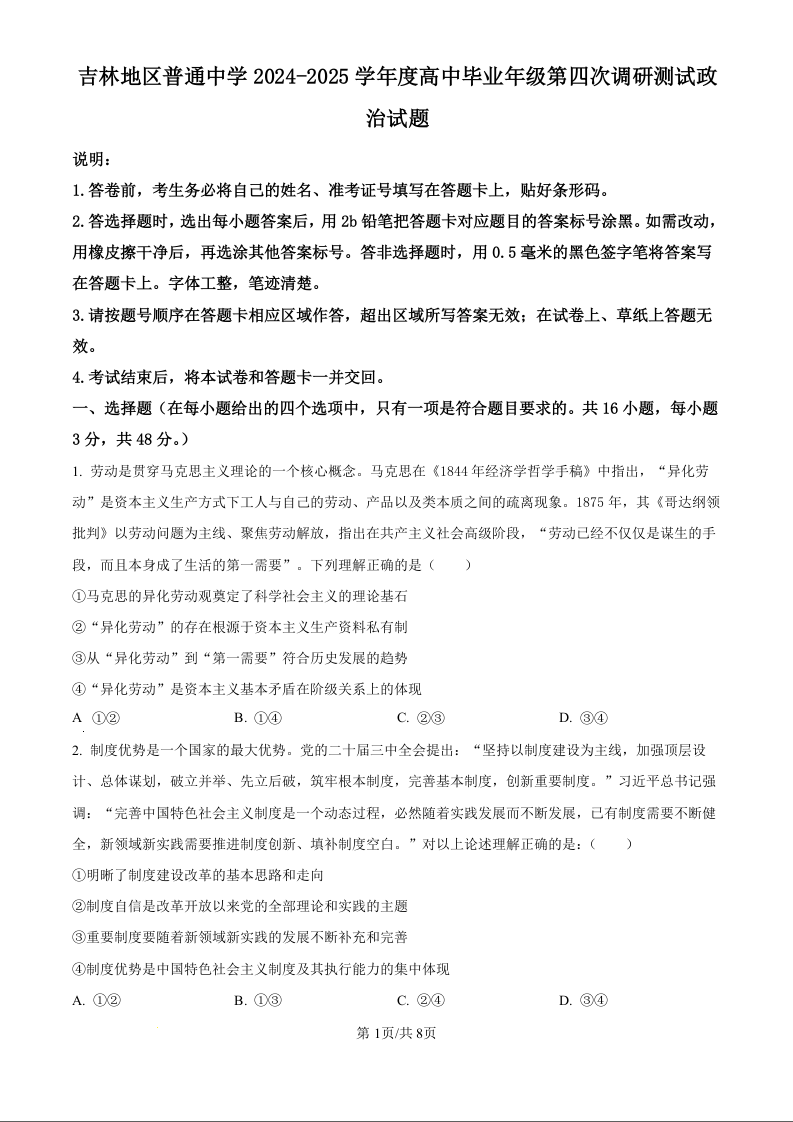 吉林省吉林地区2025届高中毕业年级第三次调研测试(三模)政治(原卷版)