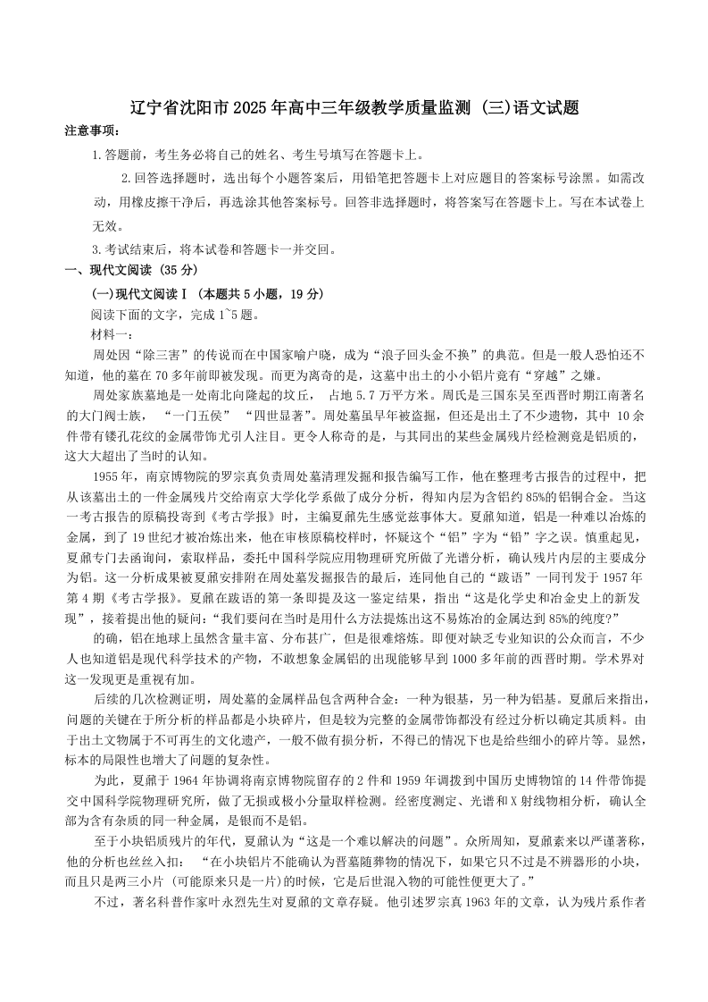 辽宁省沈阳市2025届高三下学期教学质量监测(三模)语文+答案