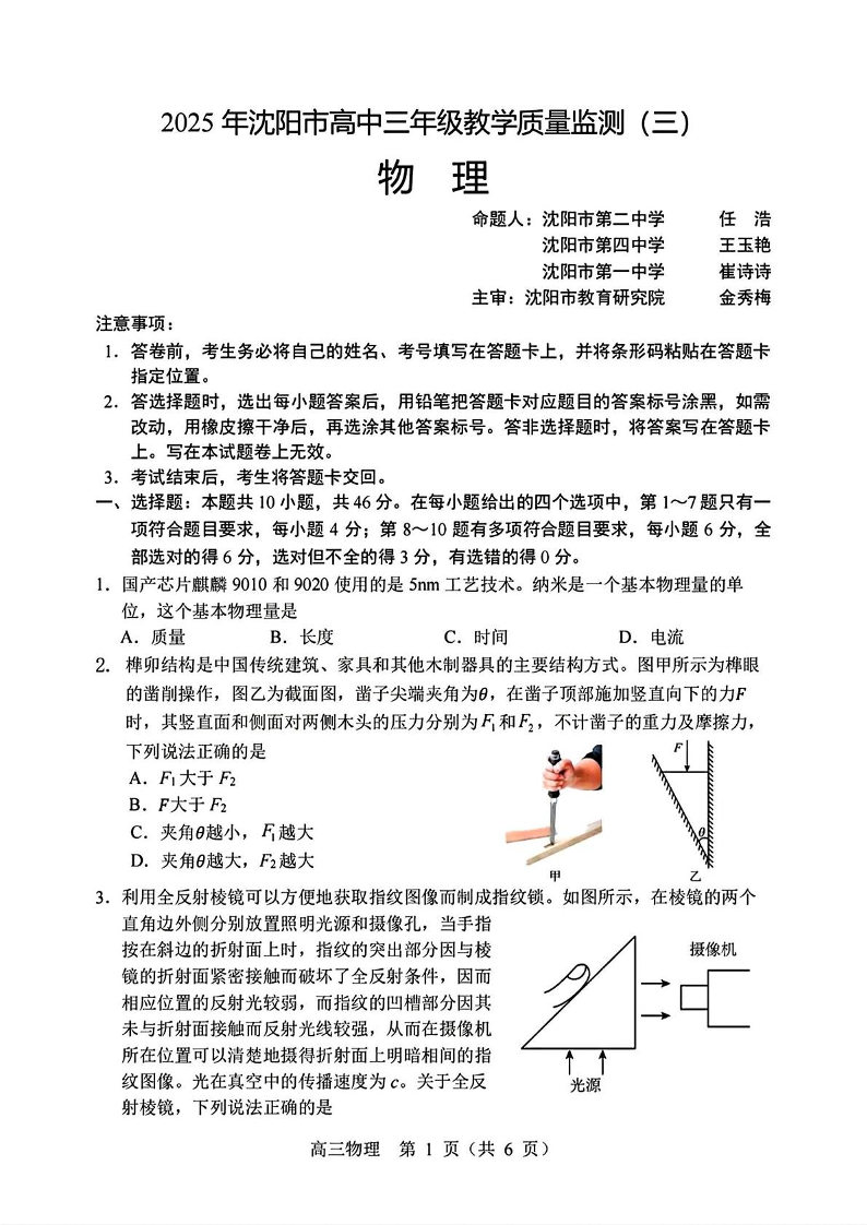 辽宁省沈阳市2025届高三下学期教学质量监测(三模)物理+答案