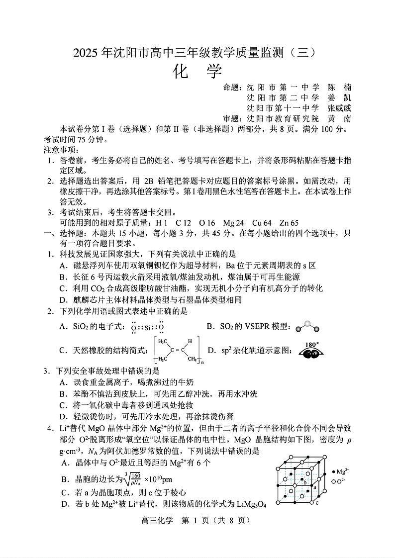 辽宁省沈阳市2025届高三下学期教学质量监测(三模)化学+答案