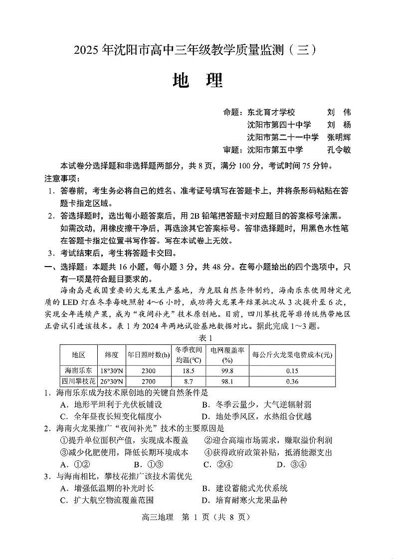 辽宁省沈阳市2025届高三下学期教学质量监测(三模)地理