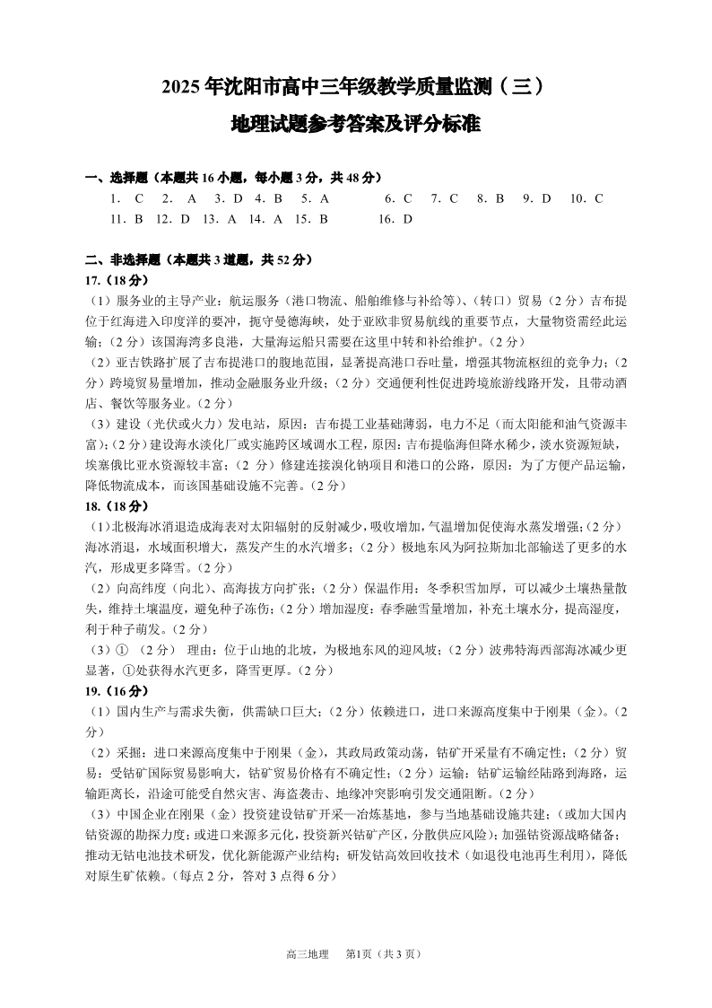辽宁省沈阳市2025届高三下学期教学质量监测(三模)地理答案