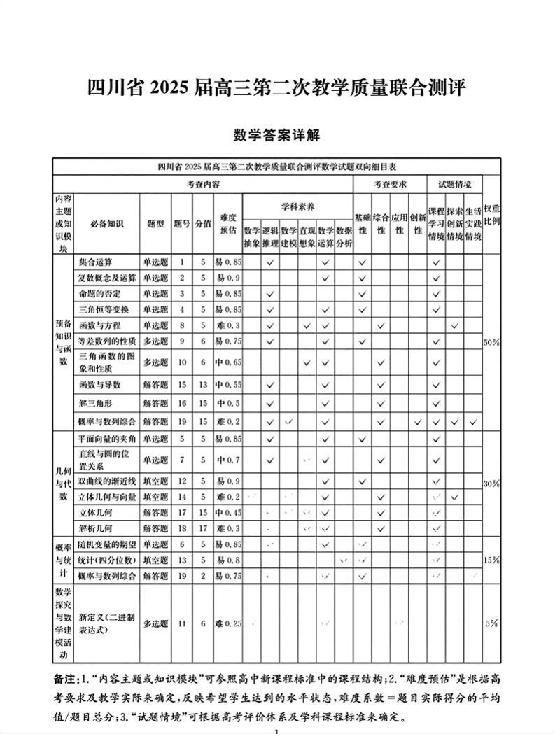 四川省大数据联考2025届高三第二次教学质量联合测评数学答案