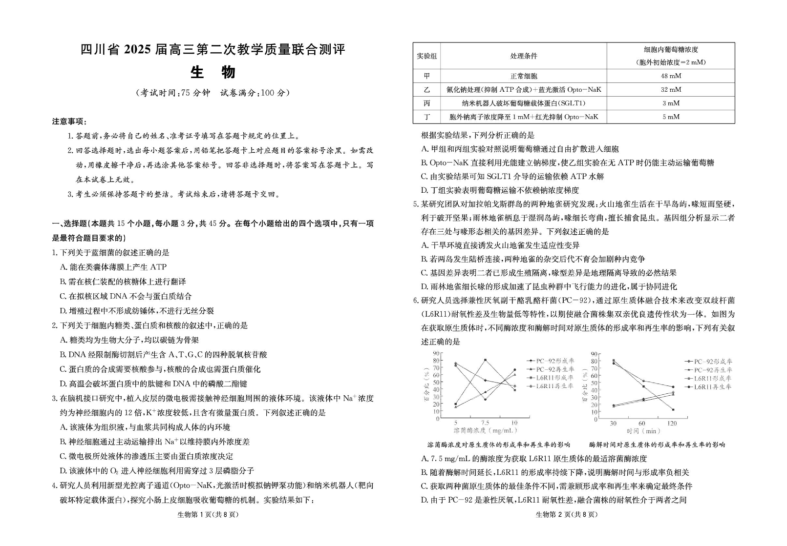 四川省大数据联考2025届高三第二次教学质量联合测评生物