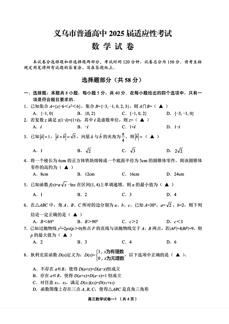 浙江省金华市义乌市2025届高三5月三模适应性考试数学+答案