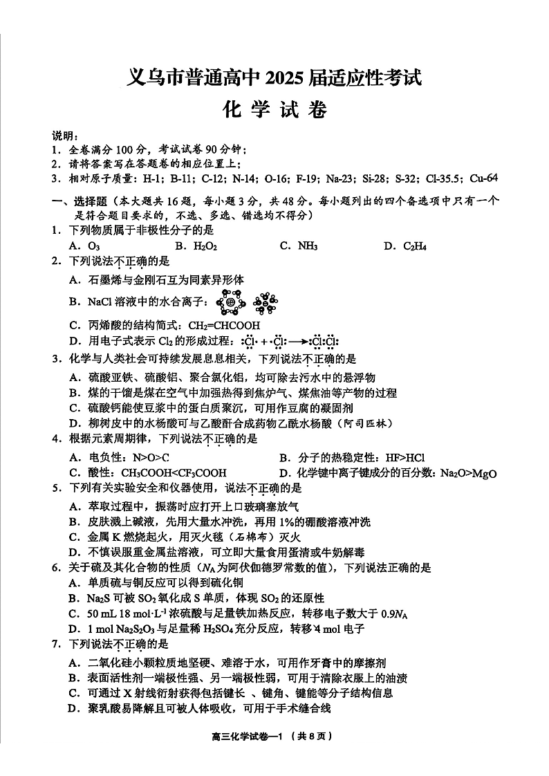 浙江省金华市义乌市2025届高三5月三模适应性考试化学