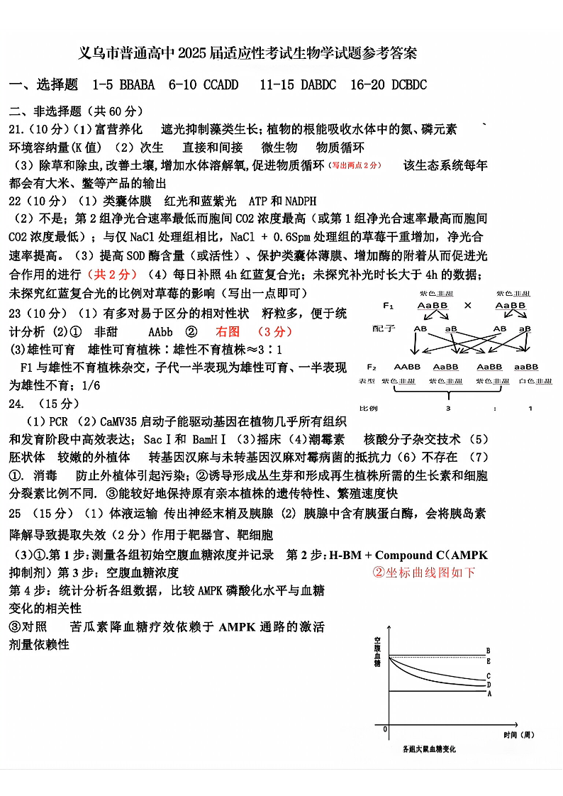 浙江省金华市义乌市2025届高三5月三模适应性考试生物答案