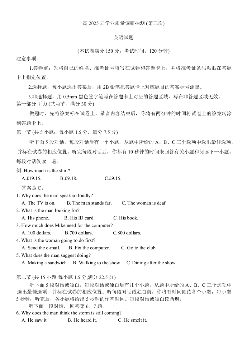 重庆市高中2025届高三5月学业质量调研抽测(三)英语