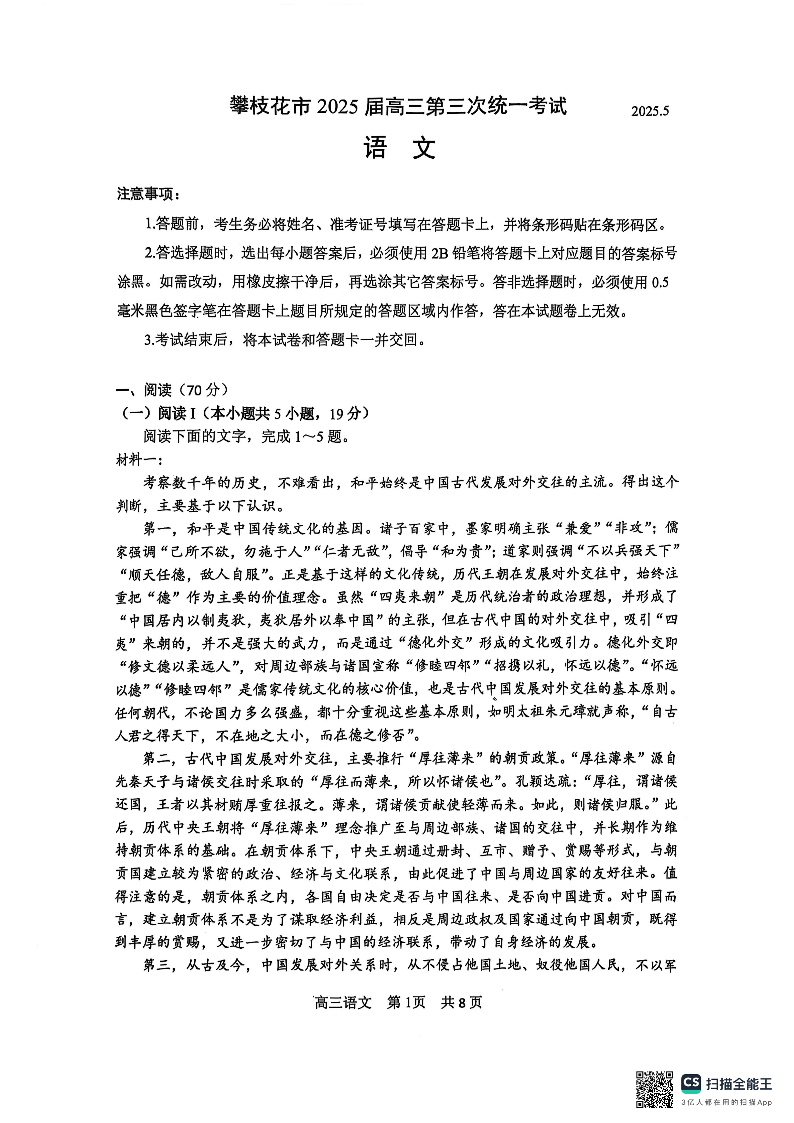 四川省攀枝花市2025届高三5月第三次统一模拟考试语文