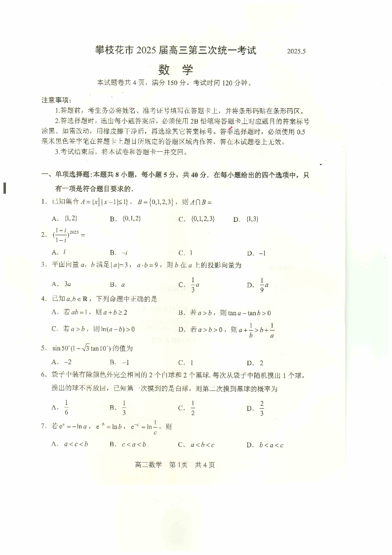 四川省攀枝花市2025届高三5月第三次统一模拟考试数学