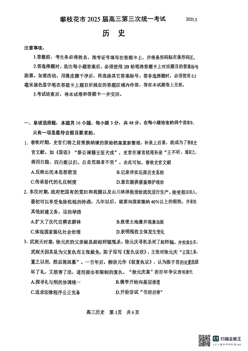 四川省攀枝花市2025届高三5月第三次统一模拟考试历史