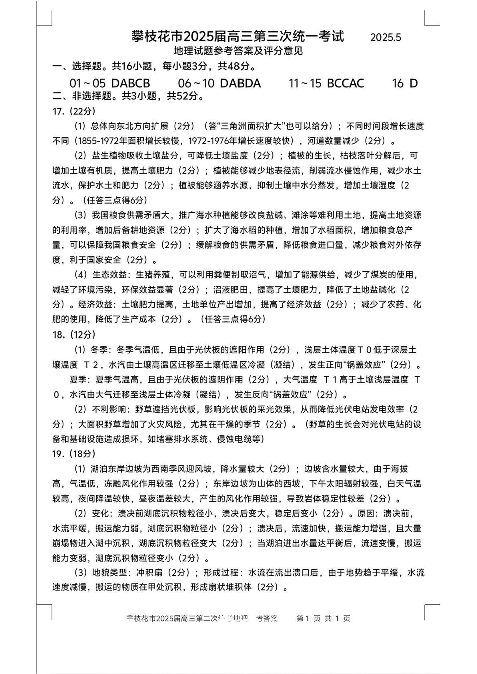 四川省攀枝花市2025届高三5月第三次统一模拟考试地理答案