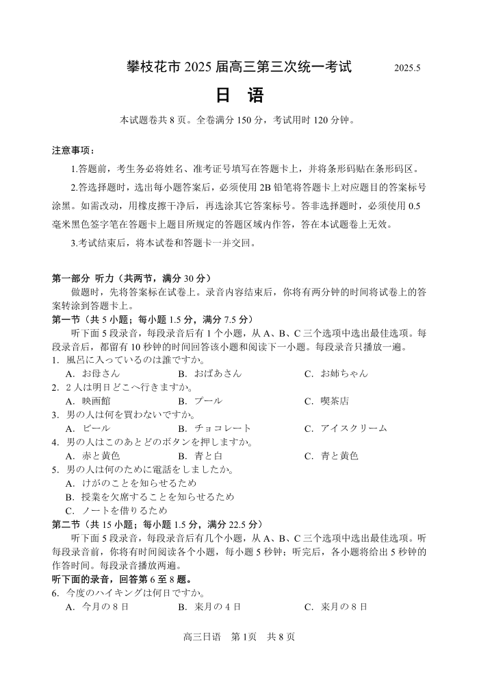 四川省攀枝花市2025届高三5月第三次统一模拟考试日语