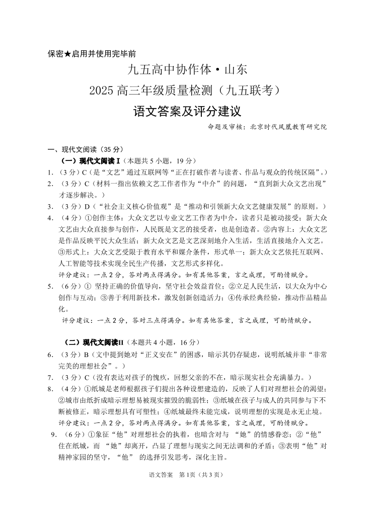 山东省区域高中2025届高三年级联合质量检测(九五联考)语文答案