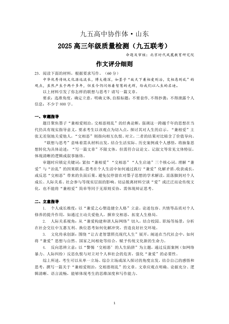 山东省区域高中2025届高三年级联合质量检测(九五联考)语文作文评分细则