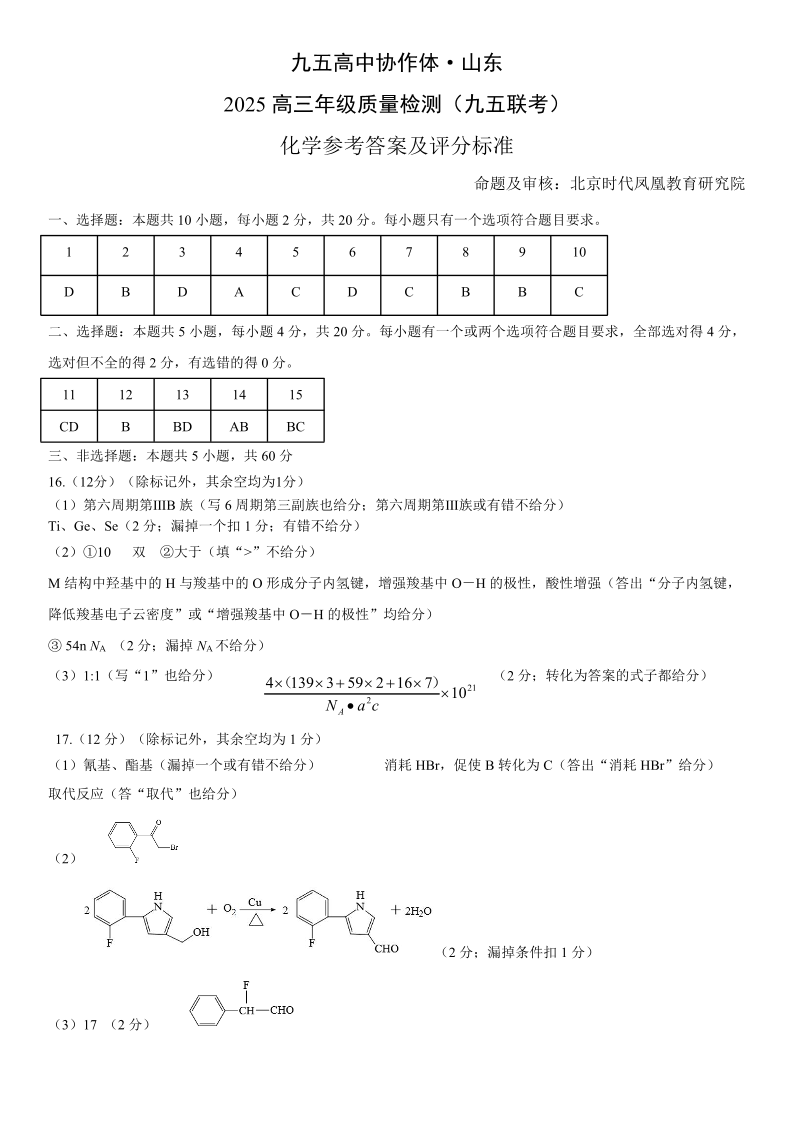 山东省区域高中2025届高三年级联合质量检测(九五联考)化学答案