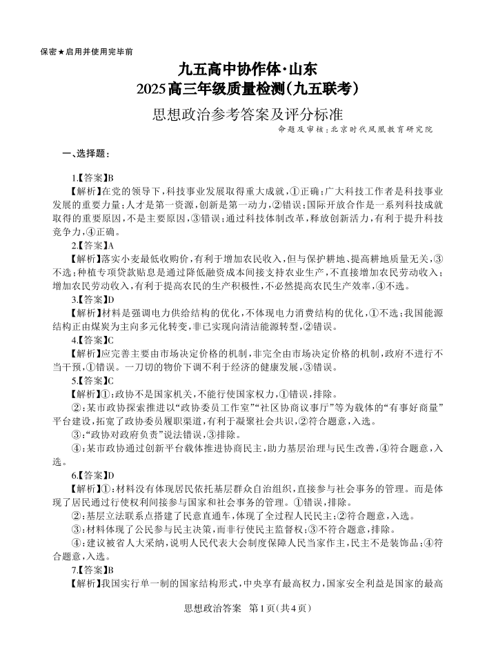 山东省区域高中2025届高三年级联合质量检测(九五联考)政治答案